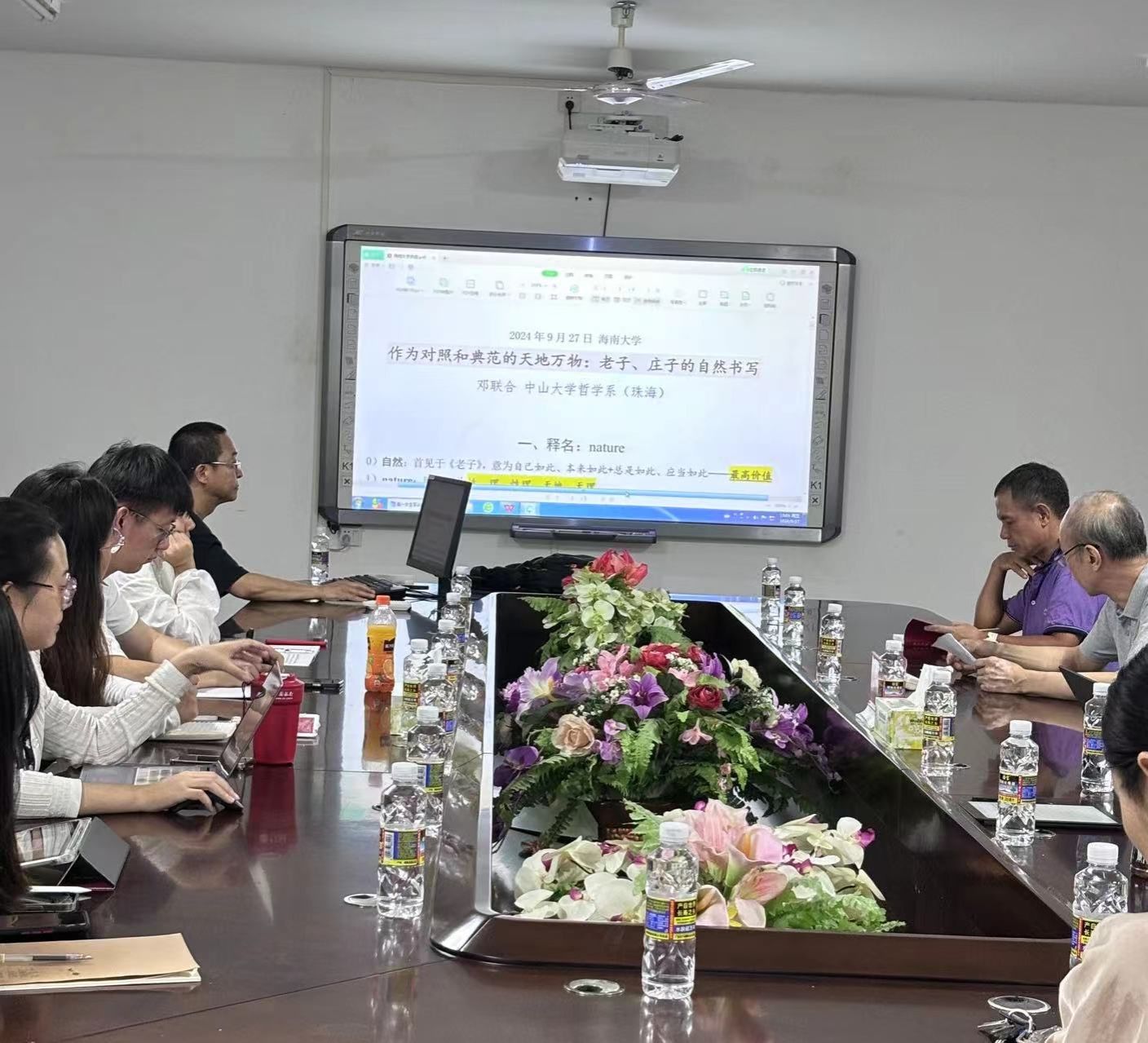 2024年9月27日晚19:00,Beat365唯一官方网站邀请中山大学哲学系(珠海)邓联合教授在社科楼A311会议室为学院师生作“作为对照和典范的天地万物——老子、庄子的自然书写”专题讲座。讲座由Beat365唯一官方网站黄启祥教授主持,学院部分教师、本硕博学生参加了本次讲座。