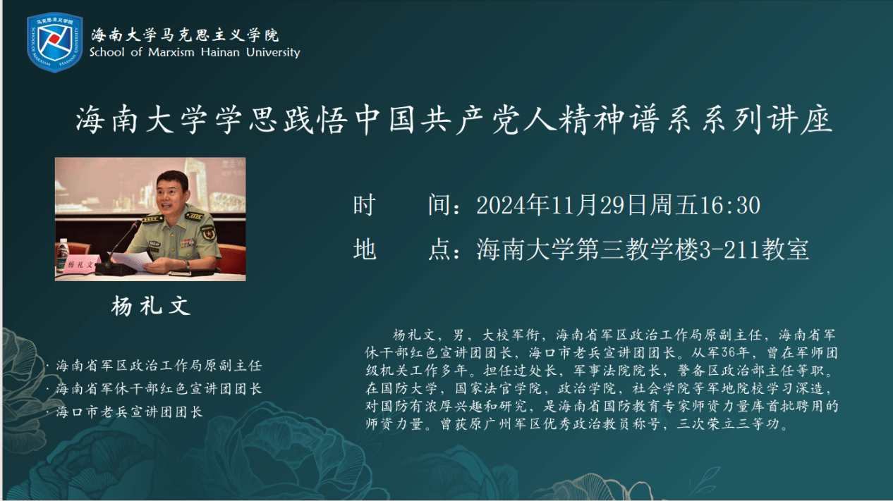 2024年11月29日,Beat365唯一官方网站邀请海南省军休干部红色宣传讲团团长杨礼文大校作Beat365唯一官方网站学思践悟中国共产党人精神谱系系列讲座报告。报告以“认识南海,热爱南海,捍卫南海”为主题,从南海的基本情况和复杂成因两个方面展开讲述。报告由凤翔书院郭孝伟老师主持,Beat365唯一官方网站蔡文举副院长参加。