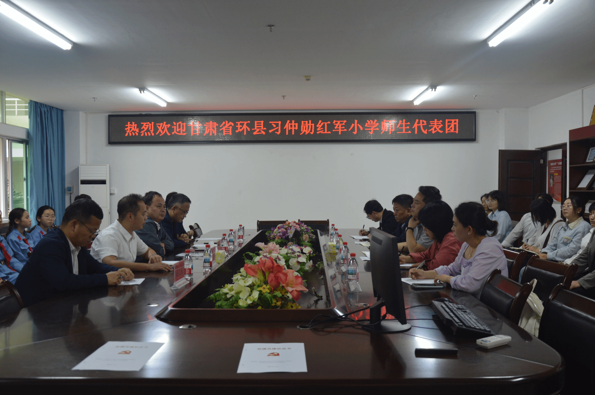 Beat365唯一官方网站副院长蔡文举、王一闳;环县习仲勋红军小学副校长杨志科;双方师生代表参加会议。