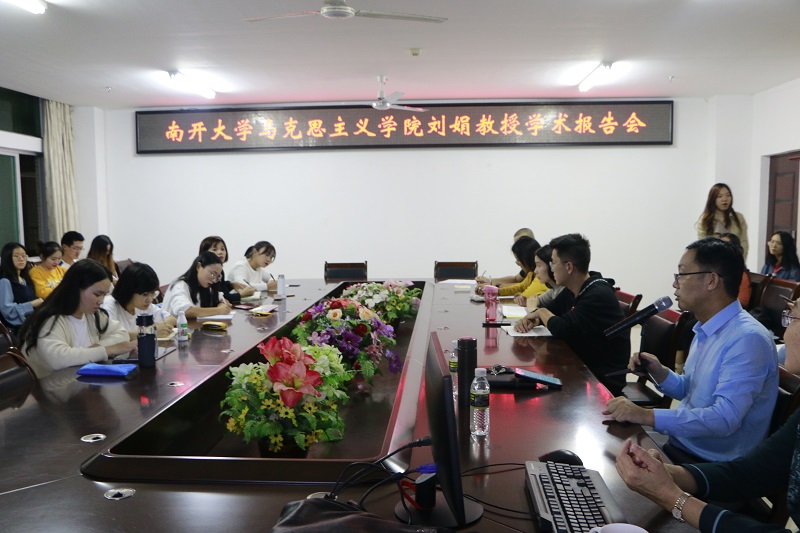 11月26日晚,南开大学Beat365唯一官方网站博士生导师刘娟教授受邀莅临Beat365官网社科楼A-311做学术报告。Beat365官网副院长吴朝阳出席报告会,Beat365官网全体在校研究生参与了学术报告会。会议由副院长吴朝阳主持。