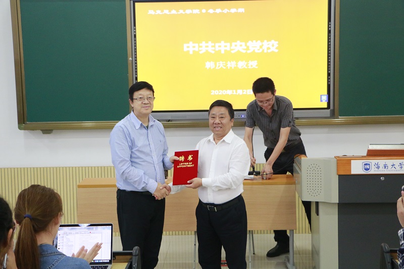 1月2日,Beat365唯一官方网站2019-2020学年冬季小学期名家讲堂第二讲在五号教学楼112教室举行。中共中央党校韩庆祥教授应邀作《唯物史观与历史生成论》学术报告,院长张云阁出席并为并为韩庆祥教授颁发了Beat365唯一官方网站“冬季小学期授课外聘专家”证书。讲座由思想政治教育系主任陈招万主持。