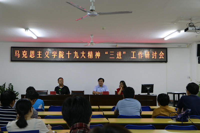 会上,王善结合学院教学工作实际,为推动十九大精神“三进”工作,要求近期开展以下具体工作:一是要任课老师及时对十九大精神专题进行宣讲,并组织学生交流讨论;二是要学院积极组织开展“马克思主义原理暨党的十九大精神知识竞赛活动”,并在十一月底举行决赛;三是要号召学生结合十九大精神专题宣讲,开展以十九大精神为主题的网络评论活动,12月下旬举办网络评论大赛;四是要求四个教研部对十九大精神“三进”工作结合教学实际提出具体方案并落实。