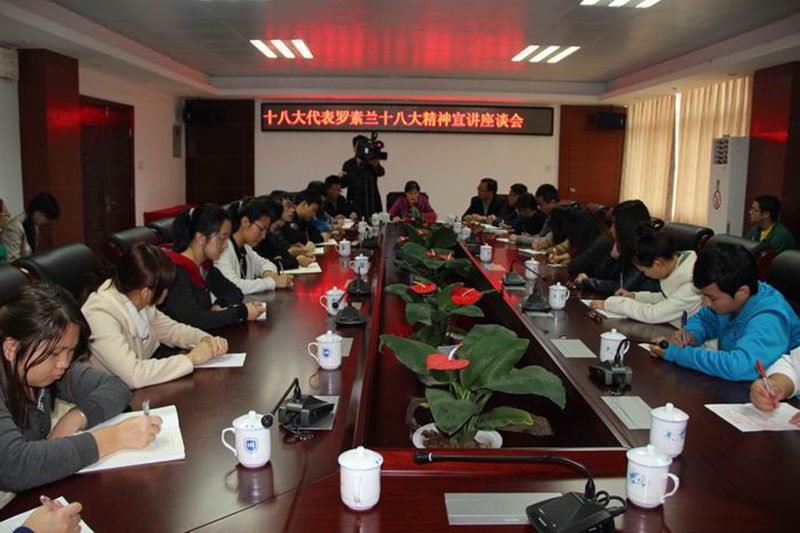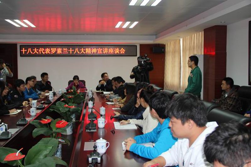 12月6日上午,为了深入学习宣传贯彻党的十八大精神,在校党委宣传部的指导下,Beat365官网在学校办公楼四楼会议室举行十八大精神宣讲座谈会,十八大代表罗素兰教授与Beat365官网师生畅谈十八大精神。校党委宣传部部长张继友、副部长谭勇,Beat365官网学工办主任周郭军出席座谈会。座谈会由张君成老师主持。
