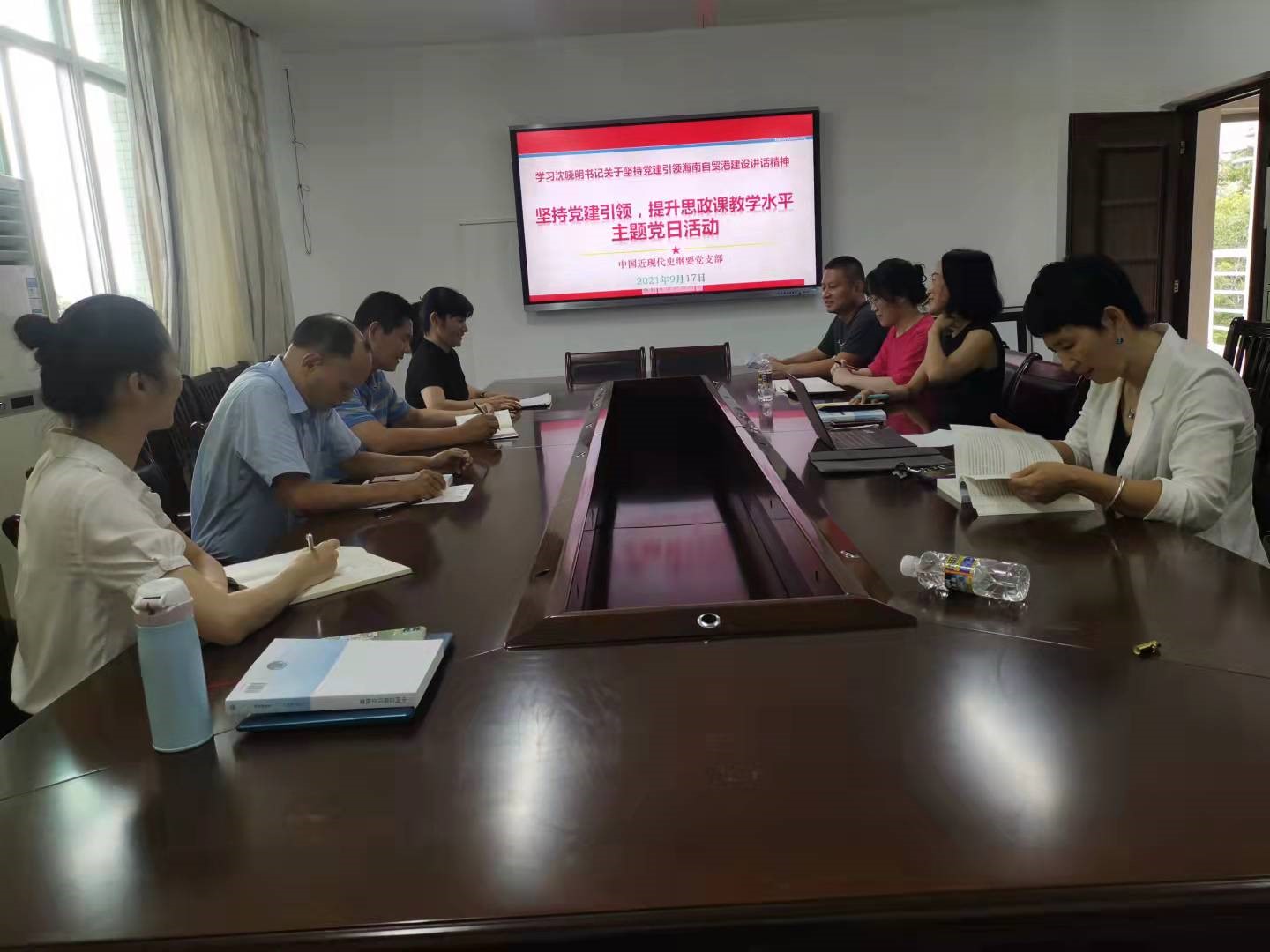 9月17日下午,中国近现代史纲要党支部在社科楼A308会议室,围绕沈晓明书记关于坚持党建引领海南自贸港建设的讲话精神,开展了”坚持党建引领,提升思政课教学水平”的主题党日活动。支部全体党员共同进行了交流和学习,在学习和交流过程中,支部各位党员同志认真学习了讲话精神,重新认识了坚持党建引领,讲好思政课,以更好服务海南自由贸易港建设的重要性和必要性,党员同志们纷纷结合自身实际,就如何将讲话精神切实润物细无声的融入新学期教学活动中谈了自己的看法,新入职的党员同志谈了自己的想法,老党员同志进行了具体经验介绍。