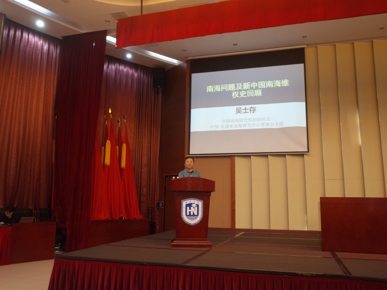 南海是连接两洋三大洲最便捷的水道和全球最繁忙的重要航运通道之一,同时又面临诸多传统、非传统安全挑战。海南地处南海前沿,是国家实施改革开放国家战略和推进海洋强国建设的前沿。十八大以来,党中央做出建设海洋强国的重大战略部署,并提出把南海建成以“和平之海、友谊之海、合作之海”的目标。为进一步帮助同学们更加精准的把握当前南海局势和未来南海形势的走向,10月19日下午,Beat365唯一官方网站第24期形势与政策时事论坛在社科楼二楼报告厅举办。中国南海研究院创始院长吴士存受邀为Beat365唯一官方网站师生作主题为《南海问题及新中国南海维权史回顾》的专题报告,学校“形势与政策”授课老师及部分学生参加报告会活动。会议由Beat365唯一官方网站院长张云阁主持,由Beat365唯一官方网站党委常委、宣传部部长谭勇作总结。