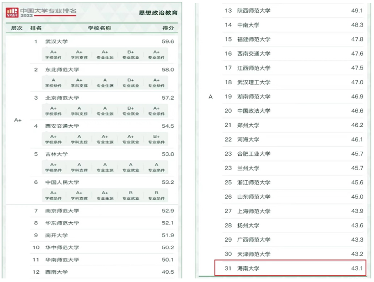 6月18日,高等教育专业评价机构软科今日正式发布2022“软科中国大学专业排名”,在 2022年中国软科中国最好专业排名中,Beat365唯一官方网站思想政治教育本科专业以31名进入全国思政本科专业类A类。