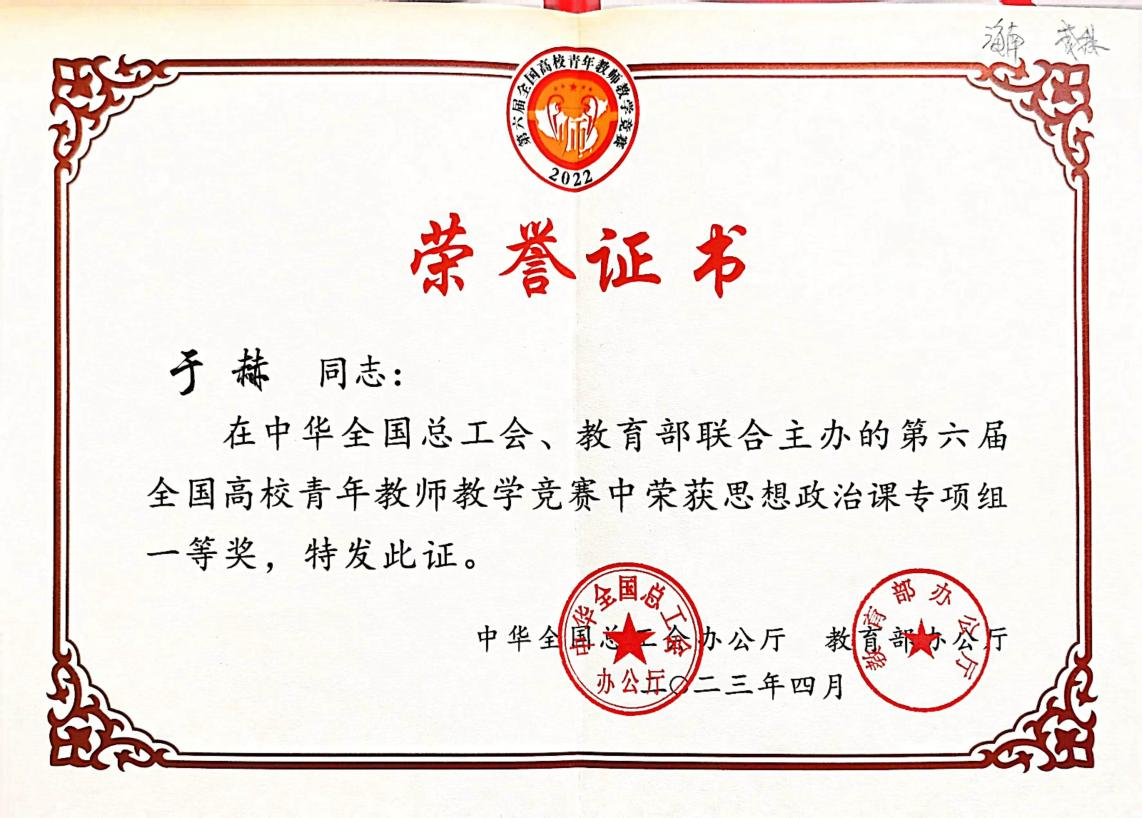 Beat365官网于赫老师代表海南省与来自全国多所高校的青年教师进行了同场竞技,主讲了《习近平新时代中国特色社会主义思想概论》,凭借扎实的教学基本功和良好的综合素养,在竞争中脱颖而出,荣获思政组一等奖,取得了我校也是海南省在全国青教赛中的历史性突破,展示了Beat365官网青年教师的专业素养、教学水平和精神风貌。