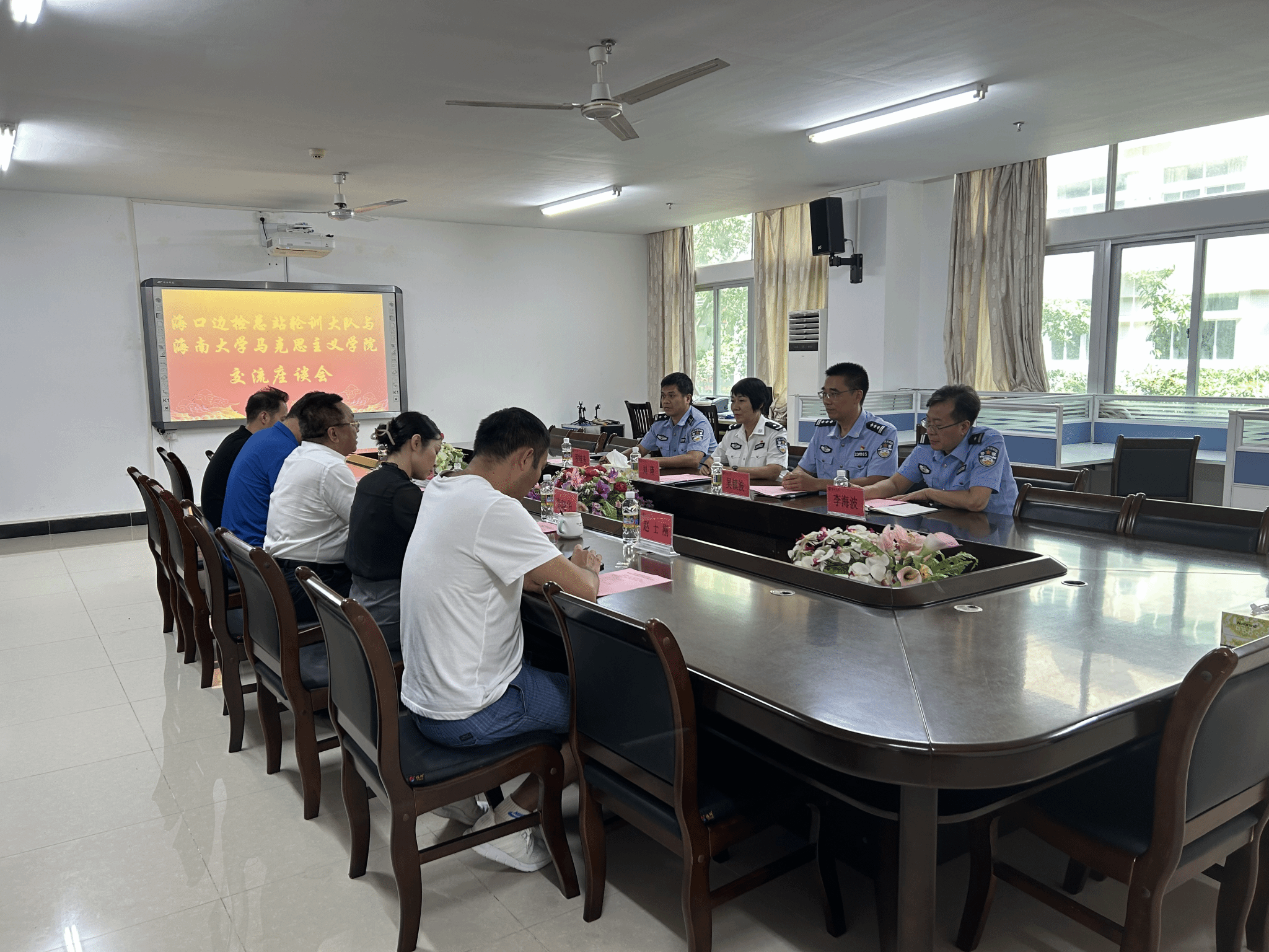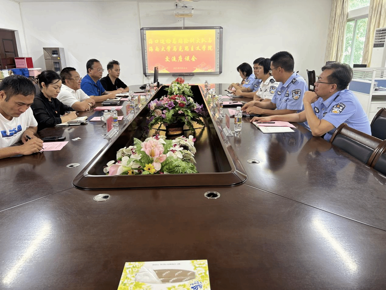 2023年9月20日海口边检总站轮训大队与Beat365唯一官方网站在社科楼A311会议举行交流座谈会,海口边检总站轮训大队大队长刘瑛、副大队长吴镇波、处长程桂东、教员李海波和陈蕾出席座谈会,Beat365唯一官方网站部分领导班子成员和科室主任参加会议,会议由学院党委书记段捷频主持。