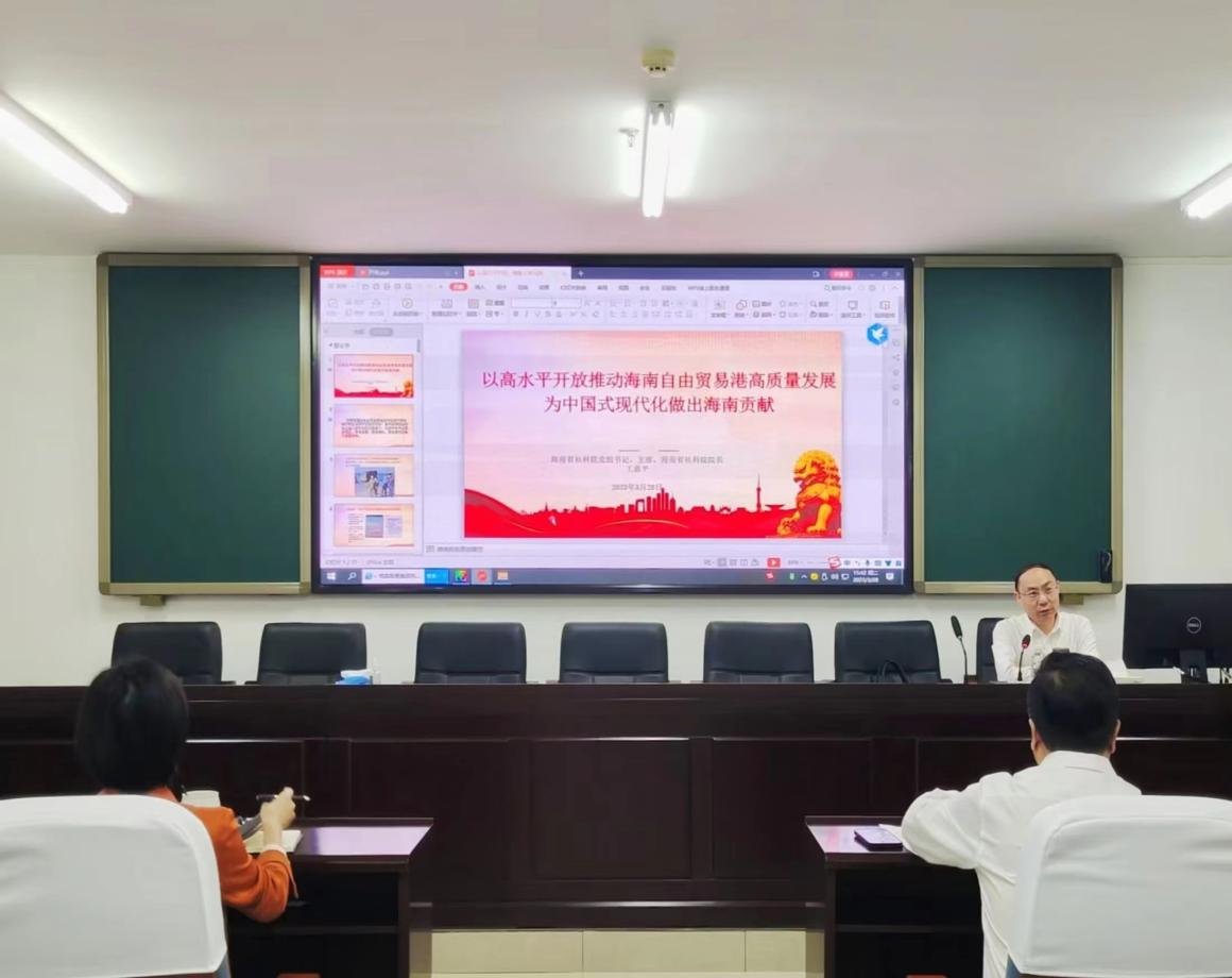 王惠平书记以党的二十大报告和2023年两会政府工作报告为切入点,强调了党中央对海南自由贸易港建设的高度重视。然后紧紧围绕海南自由贸易港建设取得的显著成就、存在的问题和以高水平开放推进海南自由贸易港高质量发展的措施与建议三个方面展开了详细的讲解。他强调要把握好“自信与自省”、“战略判断与战术决断”、“破与立”等八个辩证关系来推动海南自由贸易港的高质量发展。