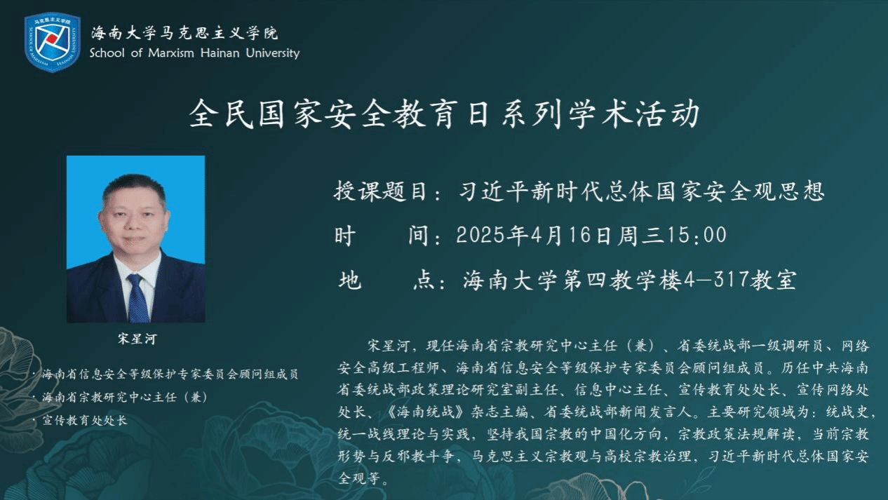 2025年4月16日下午,Beat365唯一官方网站邀请海南省信息安全等级保护专家委员会顾问组成员宋星河,以“习近平新时代总体国家安全观思想”为主题,从历史文化、风险挑战与实践路径三个维度为学生开展讲座。